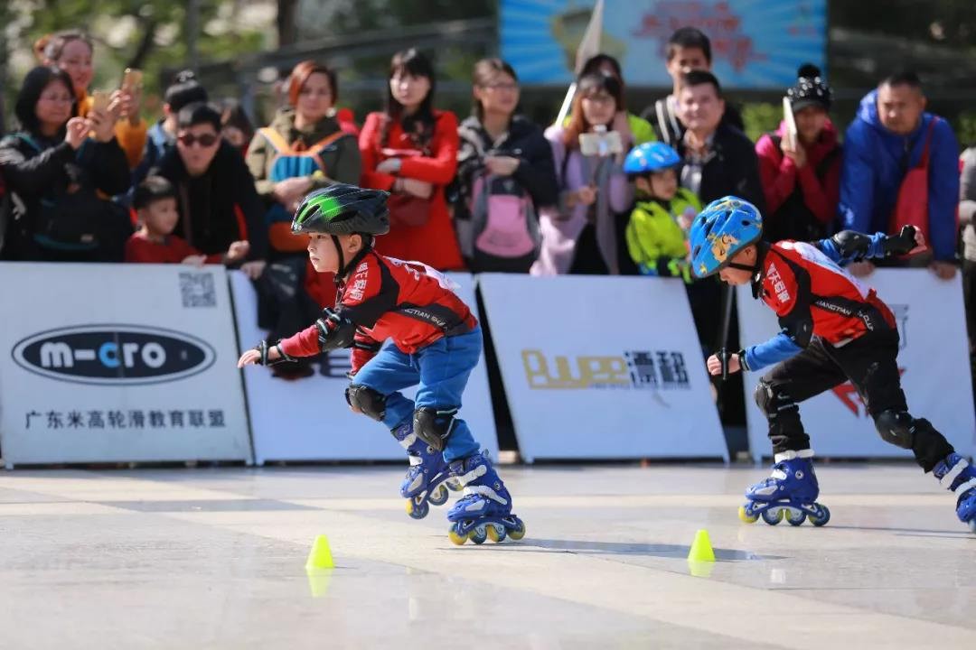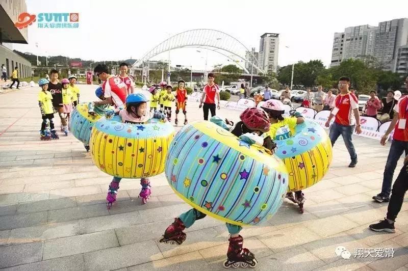 (5)亲子欢乐接力:家长须配戴护具、轮滑鞋在指定区域内,小朋友(穿轮滑鞋)与家长进行来回接力,先到达终点者为胜。